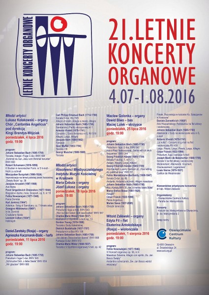W okresie od 4 lipca do 1 sierpnia 2016 roku w kościele św. Maksymiliana w Oświęcimiu odbyło się pięć koncertów organowych w ramach 21. Letnich Koncertów Organowych.