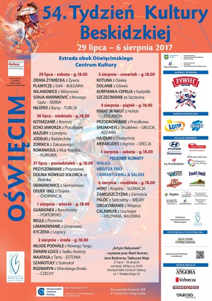 W dniach od 29 lipca do 6 sierpnia 2017 roku na pięciu głównych estradach - w Wiśle, Szczyrku, Żywcu, Makowie Podhalańskim i Oświęcimiu - odbywały się koncerty w ramach 54. Tygodnia Kultury Beskidzkiej.
