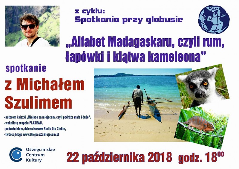 22 października 2018 roku w Oświęcimskim Centrum Kultury odbyło się dziewiąte - z cyklu podróżniczych "Spotkań przy globusie" - spotkanie z podróżnikiem, dziennikarzem Polskiego Radia RDC - Radia dla Ciebie, twórcą bloga www.MiejsceZaMiejscem.pl, autorem książki pt. "Miejsce za miejscem", czyli podróże małe i duże", wokalistą zespołu Plateau - Michałem Szulimem pt. "Alfabet Madagaskaru, czyli rum, łapówki i klątwa kameleona".