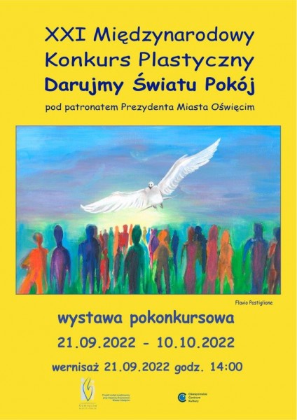 W dniach od 21 września do 10 października 2022 (podsumowanie konkursu, wręczenie nagród, otwarcie pokonkursowej wystawy w Międzynarodowym Dniu Pokoju - 21 września o godzinie 14:00) w Oświęcimskim Centrum Kultury prezentowana była pokonkursowa wystawa XXI Międzynarodowego Konkursu Plastycznego "Darujmy światu pokój" adresowanego do uczestników w wieku 7-19 lat.