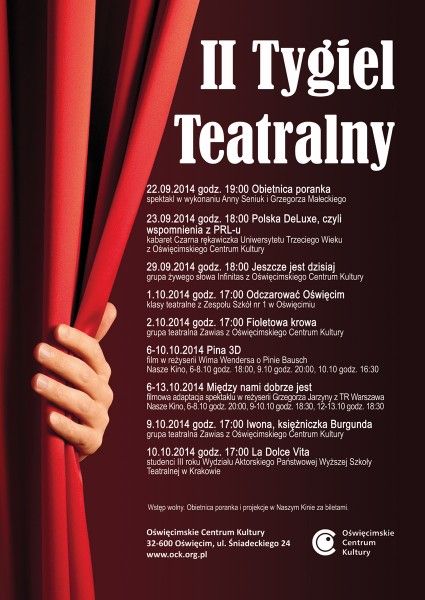 W dniach od 22 września do 10 października 2014 roku - już po raz drugi w Oświęcimskim Centrum Kultury odbywały się prezentacje teatralne w ramach "Tygla Teatralnego". Wzięły w nich udział zespoły Oświęcimskiego Centrum Kultury: grupa żywego słowa Infinitas, grupa teatralna Zawias i kabaret Czarna rękawiczka Uniwersytetu Trzeciego Wieku, klasy teatralne Zespołu Szkół nr 1 w Oświęcimiu i studenci Państwowej Wyższej Szkoły Teatralnej w Krakowie. Podczas "Tygla Teatralnego" odbywały się w "Naszym Kinie" projekcje filmów Ida oraz "Pina 3D".