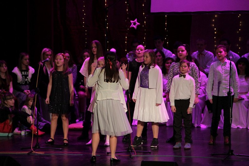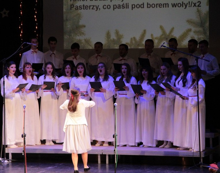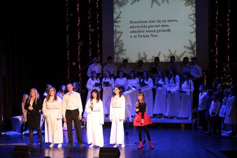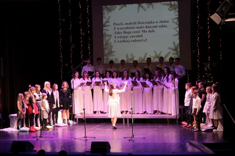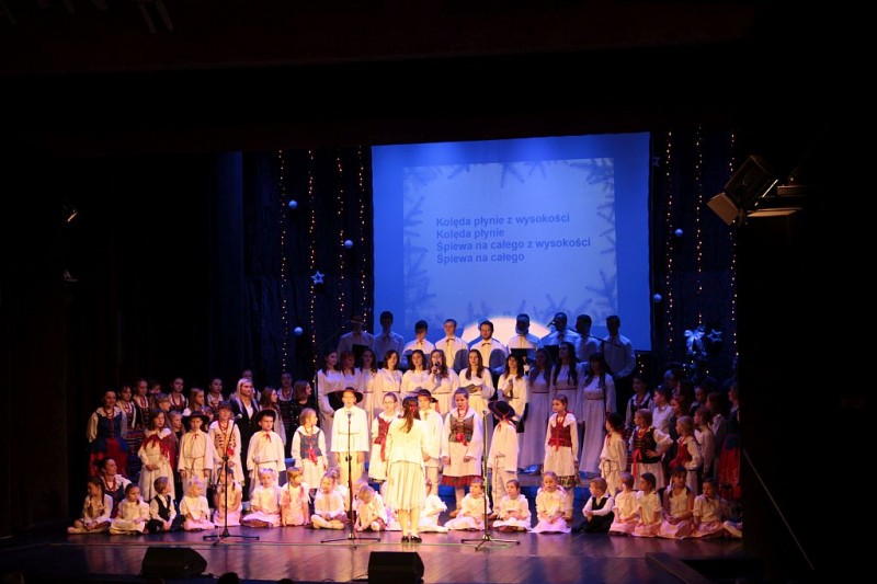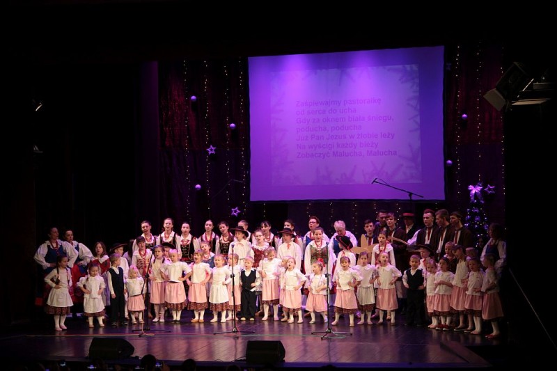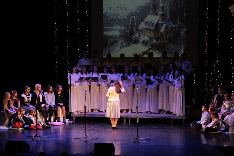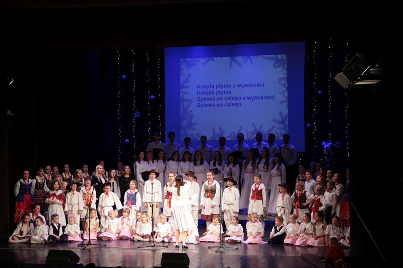 Wspólne kolędowanie w wykonaniu Chóru Centrum św. Maksymiliana w Harmężach, uczestników zajęć wokalnych Osiedlowego Domu Kultury Zasole, Reprezentacyjnego Zespołu Pieśni i Tańca Miasta Oświęcim Hajduki oraz zasiadających na widowni mieszkańców miasta.