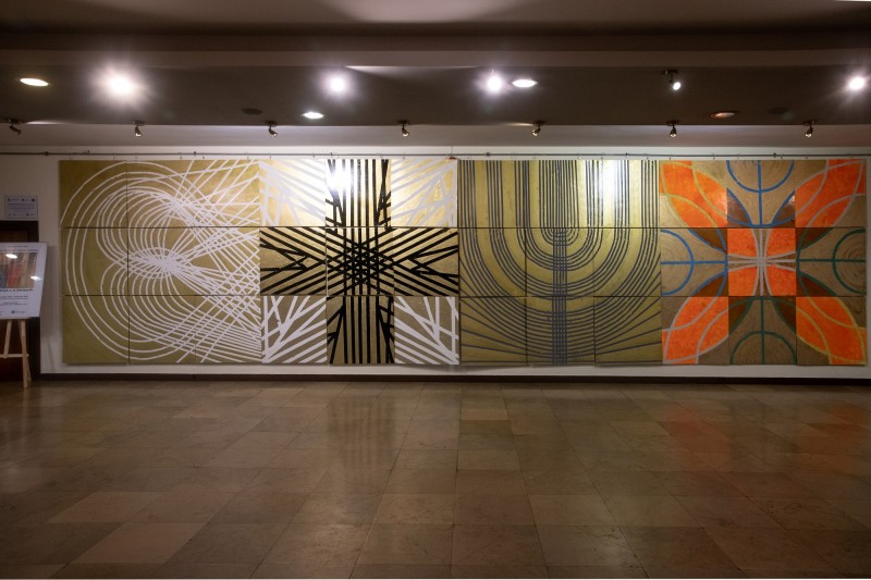 *GeoForma ‒ malarska kompozycja utworzona na powierzchni 9 x moduł bazowy. Technika materialna: Emalia olejno-ftalowa/ Bronze-powder/HDF-płyta [grub.: 2,4 mm] Powierzchnia modułu bazowego: 90 cm x 90 cm Powierzchnia GeoFormy: 3 x 90 cm x 3 x 90 cm [270 cm x 270 cm] Powierzchnia GeoTkanu: 9 x 90 cm x 3 x 90 cm [ 810cm x 270 cm]