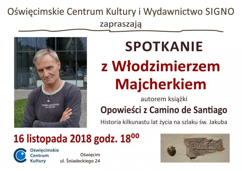 16 listopada 2018 roku w Oświęcimskim Centrum Kultury odbyło się spotkanie autorskie z Włodzimierzem Majcherkiem - autorem książki pt. "Opowieści z Camino de Santiago. Historia kilkunastu lat życia na szlaku św. Jakuba" opublikowanej w Wydawnictwie Signo.