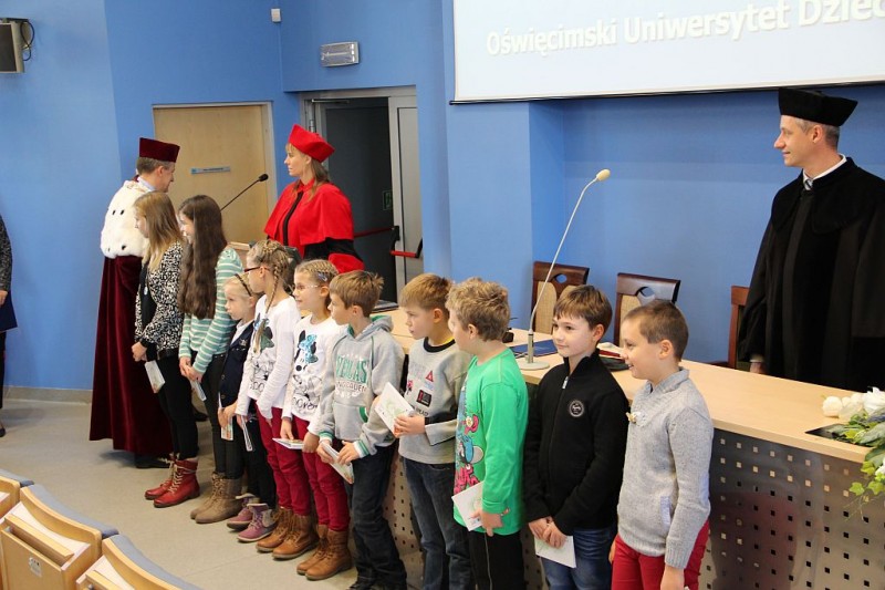 Podczas inauguracji przedstawiciele młodych studentów Oświęcimskiego Uniwersytetu Dziecięcego złożyli przysięgę i dokonany został akt immatrykulacji, czyli dotknięcie przez Rektora berłem prawego ramienia studenta i wypowiedzenie formułki: przyjmuję cię do społeczności akademickiej. Po ślubowaniu i wręczeniu indeksów Rektor wypowiedział formułkę: Quod Bonum, Felix, Faustum Fortunatumque Sit (Co niechaj będzie dobre, szczęśliwe, pomyślne oraz z pomocą losu owocne) i po trzykrotnym uderzeniu berłem w stół otworzył rok akademicki 2014/2015.