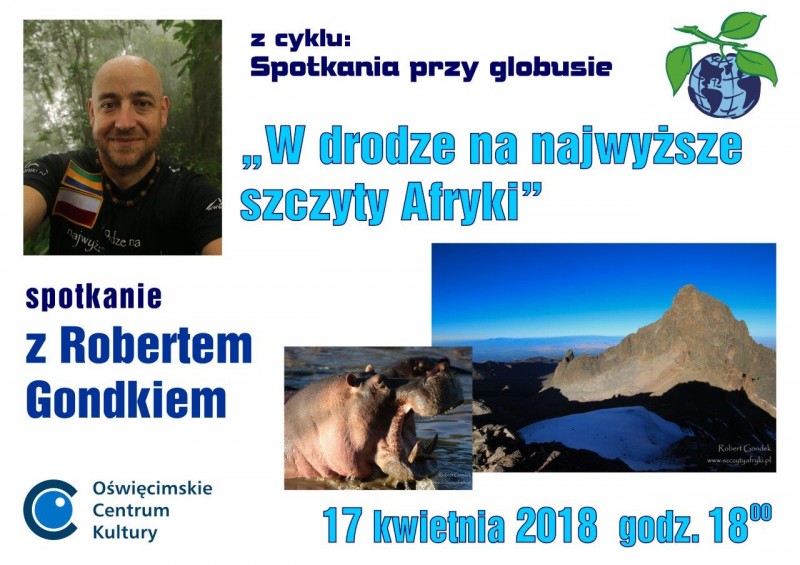 17 kwietnia 2018 roku w Oświęcimskim Centrum Kultury odbyło się piąte - z cyklu podróżniczych "Spotkań przy globusie" - spotkanie z podróżnikiem Robertem Gondkiem pt. "W drodze na najwyższe szczyty Afryki - Tanzania, Kenia, Uganda, Rwanda, Burundi".