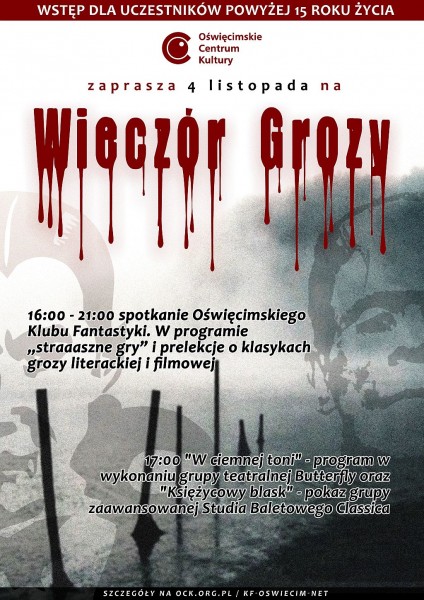 4 listopada 2016 roku - w Oświęcimskim Centrum Kultury odbył się - dla uczestników powyżej 15 roku życia - "Wieczór grozy".