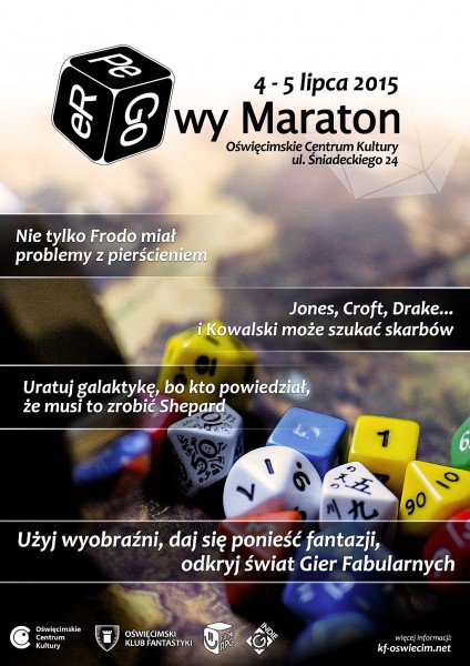 4 i 5 lipca 2015 roku w Oświęcimskim Centrum Kultury odbyła się druga edycja „eRPeGowego maratonu”, który miał na celu promocję gier fabularnych (RPG). Podczas imprezy można było posłuchać prelekcji i wziąć udział w konkursach z nagrodami. I co najważniejsze, udało się rozegrać 14 sesji, w różnych systemach i konwencjach. Sesje poprowadzili klubowi Mistrzowie Gry, ale też zaprzyjaźnione osoby z Krakowa i Jakub Zapała, twórca systemu RPG „Dwory Końca Światów”, który już po raz drugi pojawił się na „maratonie”.